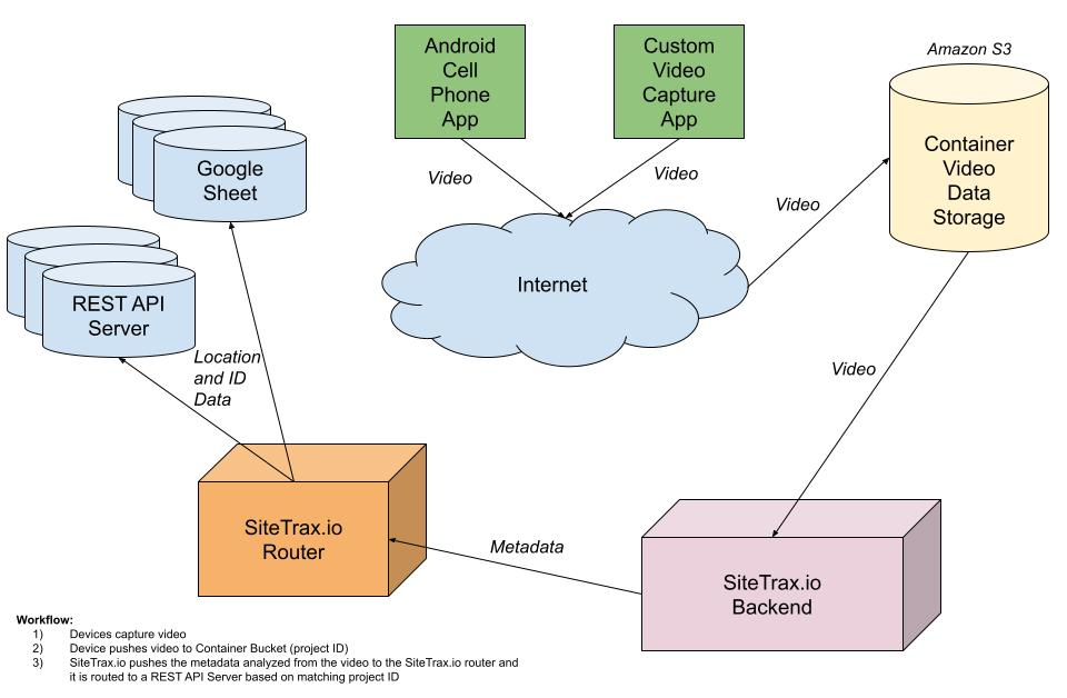 The SiteTrax.io backend analyzes video stored in an Amazon S3 bucket and outputs that data to any REST API server.